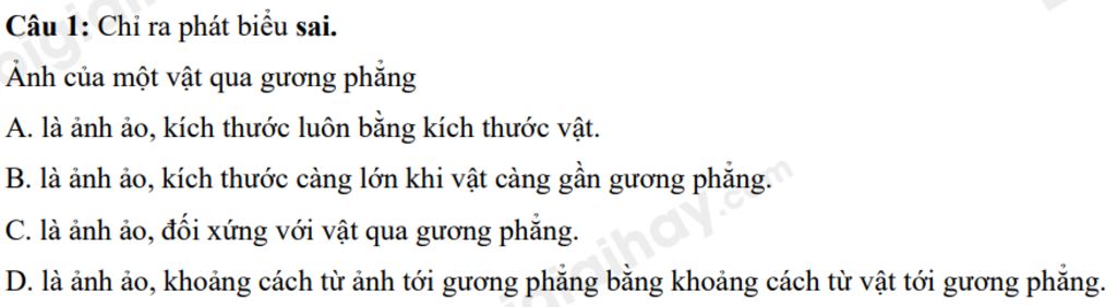 `B` sai do ảnh của vật qua gương phẳng là ảnh ảo, kích thước luôn bằng kích thước của vật