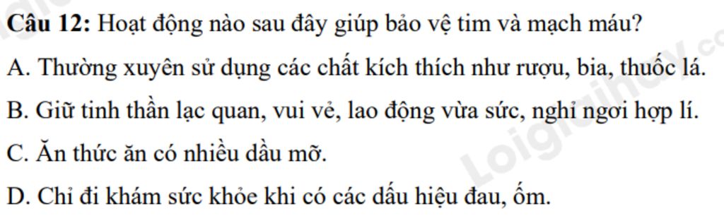 `@` Giữ tinh thần lạc quan, vui vẻ, lao động vừa sức, nghỉ ngơi hợp lí giúp bảo vệ tim và mạch máu.