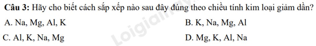 `-` Sắp xếp đúng theo chiều tính kim loại giảm dần là : K, Na, Mg, Al