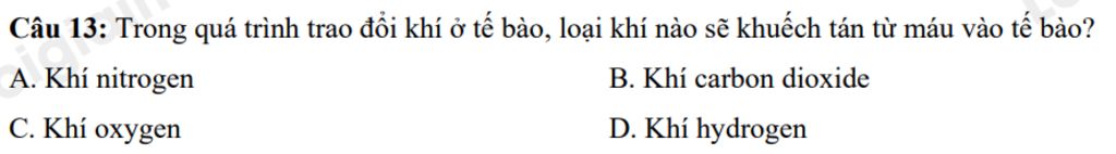 `->``bbC`$\\$`\text{Oxygen}` được khuếch tán từ máu vào tế bào để tham gia vào quá trình hô hấp tế bào và sản xuất năng lượng cho các quá trình sống cần thiết