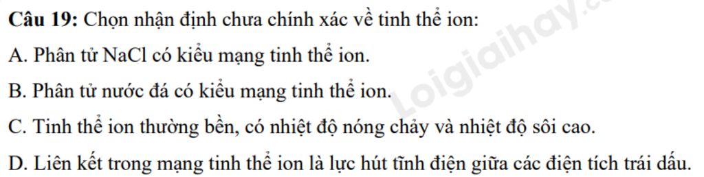 Câu `19:` Chọn nhận định chưa chính xác về tinh thể ion`:`