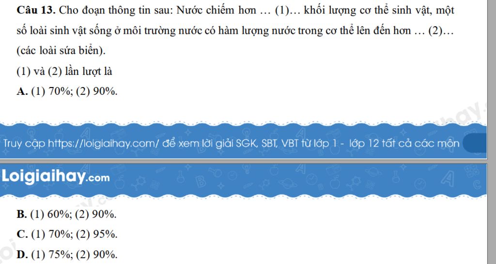 Nước chiếm hơn (1) 70% khối lượng cơ thể sinh vật, một số loài sinh vật ở môi trường nước có hàm lượng nước trong cơ thể lên đến hơn (2) 90% `(`các loài sứa biển`)`