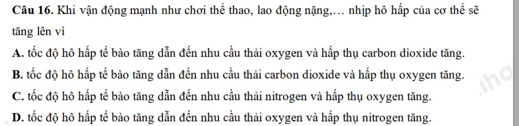 Khi vận động mạnh như chơi thể thao, lao động nặng,... nhịp hô hấp của cơ thể sẽ tăng lên vì tốc độ hô hấp tế bào tăng dẫn đến nhu cầu thải carbon dioxide và hấp thụ oxygen tăng