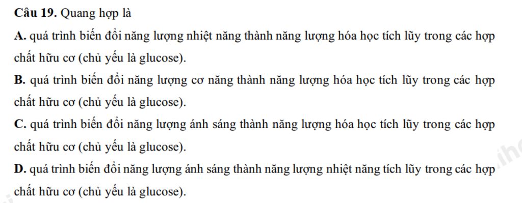 Quang hợp là quá trình biến đổi năng lượng ánh sáng thành năng lượng hóa học tích lũy trong các hợp chất hữu cơ (chủ yếu là glucose)