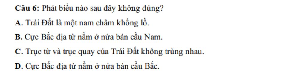 `-` Phát biểu sai là " Cực Bắc địa từ nằm ở nửa bán cầu Bắc "
