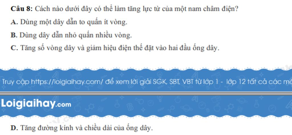 `C.` Tăng số vòng dây và giảm hiệu điện thế đặt vào hai đầu ống dây.