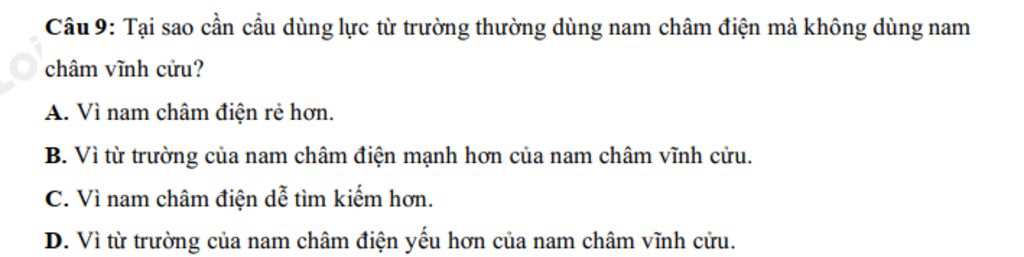 `-` Từ trường của nam châm điện mạnh hơn của nam châm vĩnh cửu nên cần cẩu dùng lực từ trường thường dùng nam châm điện mà không dùng nam châm vĩnh cửu.