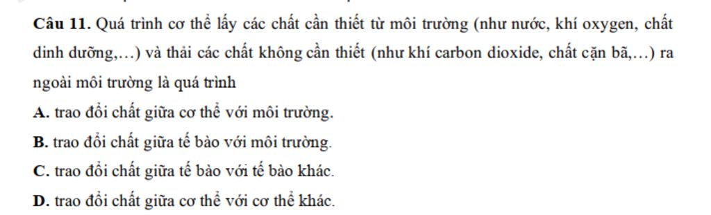 `-` Quá trình cơ thể lấy các chất cần thiết từ môi trường (như nước, khí oxygen, chất dinh dưỡng,...) và thải các chất không cần thiết (như khí carbon dioxide, chất cặn bã,...) ra ngoài môi trường là quá trình trao đổi chất giữa cơ thể với môi trường.