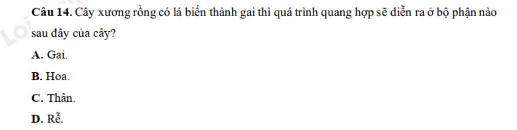 Cây xương rồng có lá biến thành gai thì quá trình quang hợp sẽ diễn ra ở bộ phận thân non. Vì ở phần thân non của xương rồng có chứa diệp lục giúp cây quang hợp