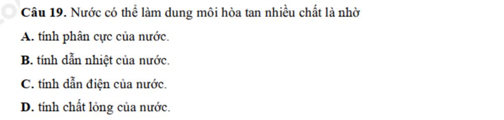 Câu 19. Nước có thể làm dung môi hòa tan nhiều chất là nhờ
