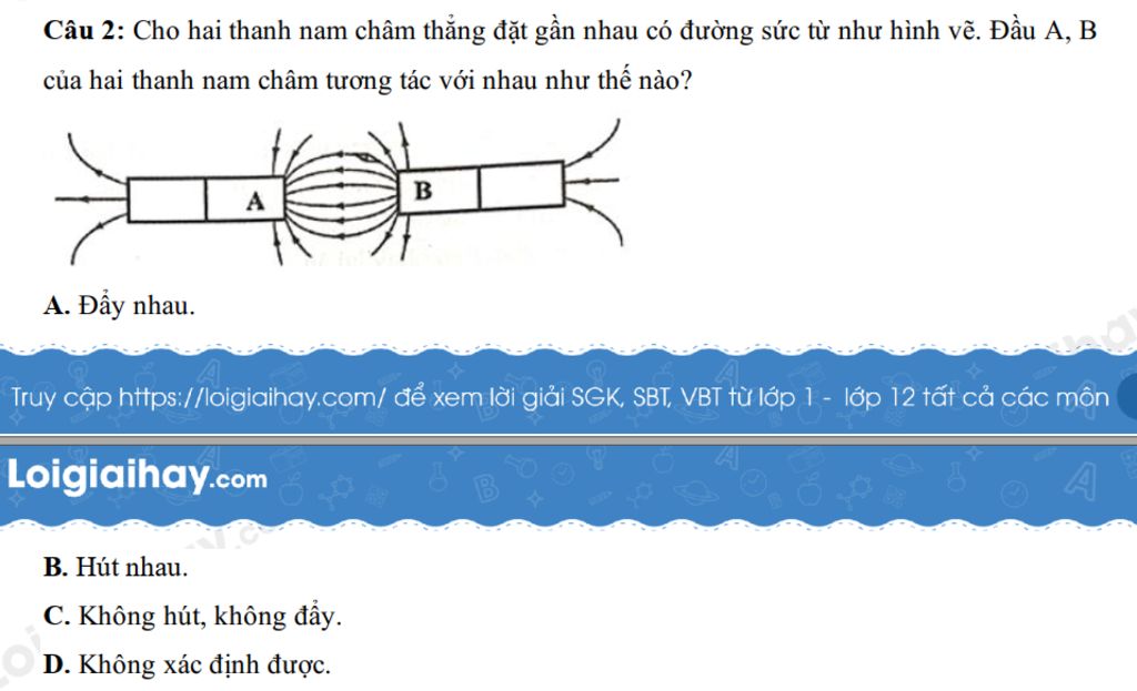 Vì :Cho hai thanh nam châm thẳng đặt gần nhau có đường sức từ như hình vẽ. Đầu A, B của hai thanh nam châm tương tác với nhau