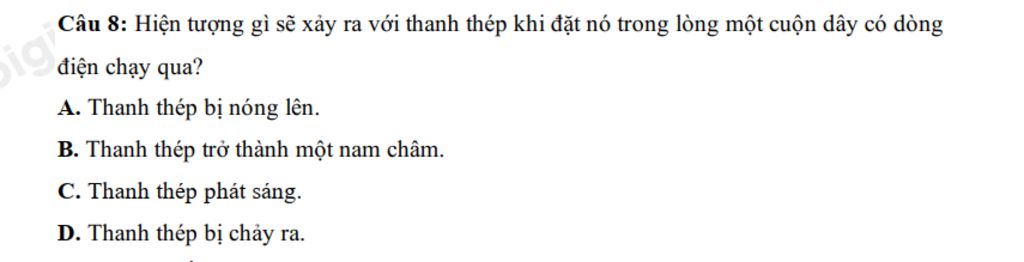 `-` Thanh thép trở thành một nam châm khi đặt nó trong lòng một cuộn dây có dòng điện chạy qua