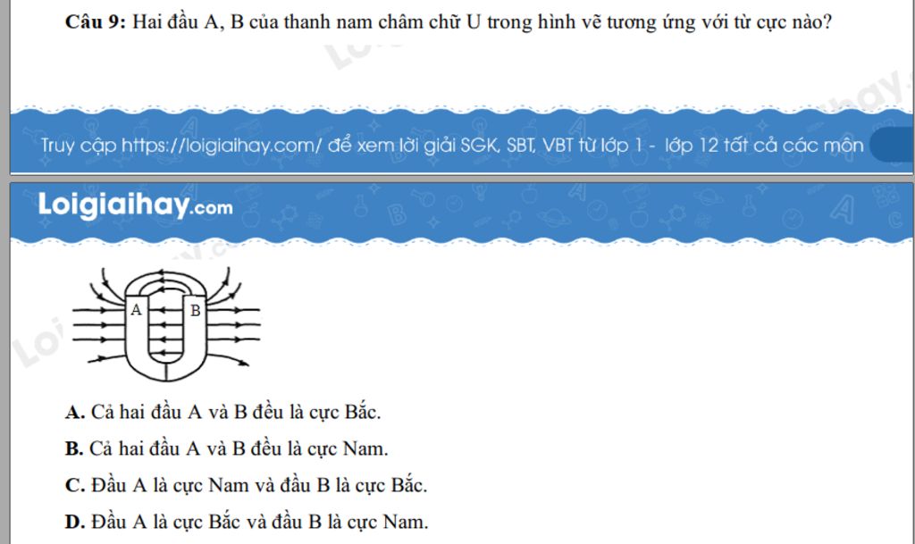 `->``bbC`$\\$ `2` đầu `A, B` của thanh nam châm chữ `U` trong hình vẽ tương ứng với từ cực đầu `A` là cực Nam và đầu `B` là cực Bắc