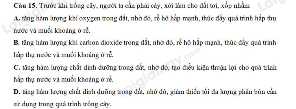 `-` Trước khi trồng cây, người ta cần phải cày, xới làm cho đất tơi, xốp nhằm tăng hàm lượng khí `O_2` trong đất, nhờ đó, rễ hô hấp mạnh, thúc đẩy quá trình hấp thụ nước và muối khoáng ở rễ.