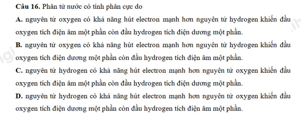 `B`. nguyên tử oxygen có khả năng hút electron mạnh hơn nguyên tử hydrogen khiến đầu oxygen tích điện dương một phần còn đầu hydrogen tích điện âm một phần.