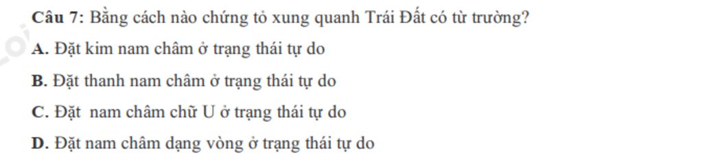 Để chứng tỏ Trái Đất có từ trường ta cần đặt kim nam châm ở trạng thái tự do: khi để tự do luôn quay về hướng Bắc `-` Nam, dù có di chuyển nó ở các vị trí khác nhau hay quay như nào đi chăng nữa thì nó luôn quay về hướng Bắc `-` Nam `=>` Trái Đất có từ trường