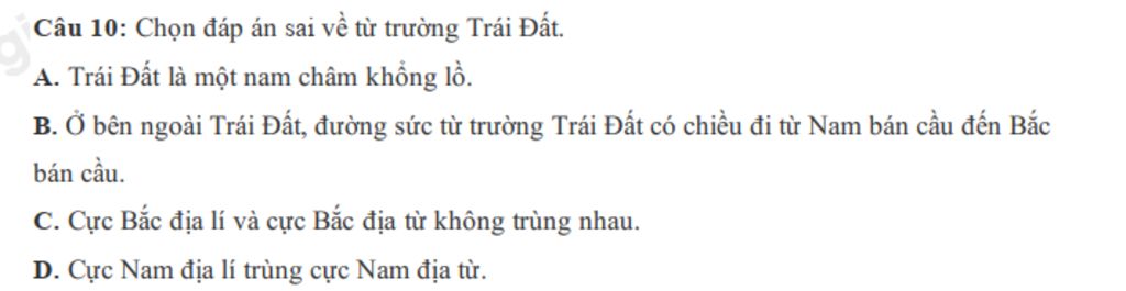 Câu 10: Chọn đáp án sai về từ trường Trái Đất.