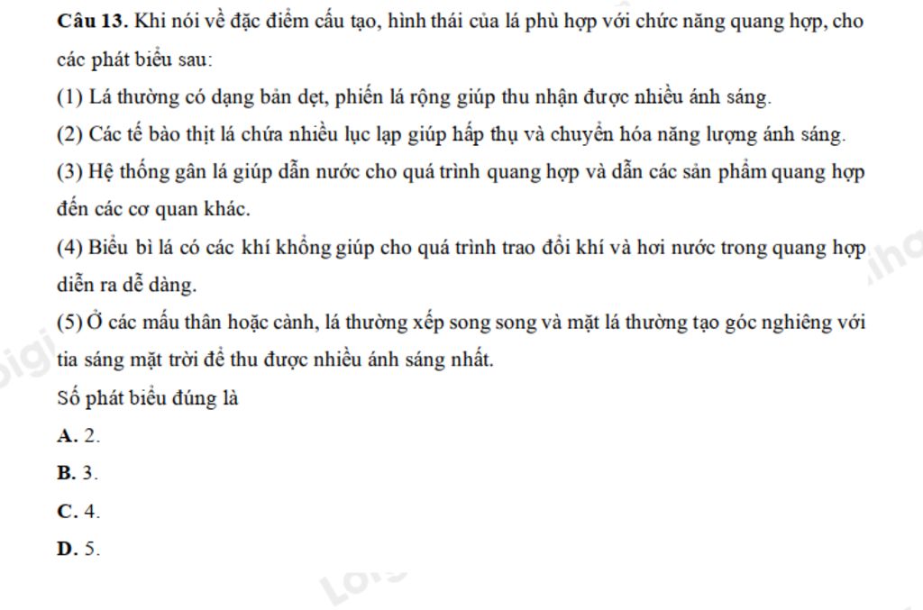 Câu `13`. Khi nói về đặc điểm cấu tạo, hình thái của lá phù hợp với chức năng quang hợp, cho