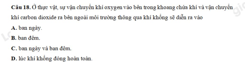 Câu 18. Ở thực vật, sự vận chuyển khí oxygen vào bên trong khoang chứa khí và vận chuyển khí carbon dioxide ra bên ngoài môi trường thông qua khí khổng sẽ diễn ra vào
