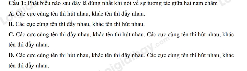 `-` Các cực cùng tên thì đẩy nhau, khác tên thì hút nhau. Các cực cùng tên thì hút nhau, khác tên thì đẩy nhau `→` Sai
