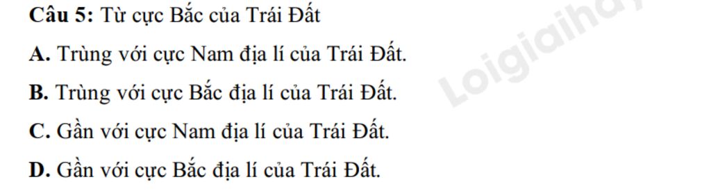 `->``bbC`$\\$Cực Bắc địa lí của Trái Đất không trùng với cực Nam địa lí của Trái Đất mà chúng cách xa nhau rất xa