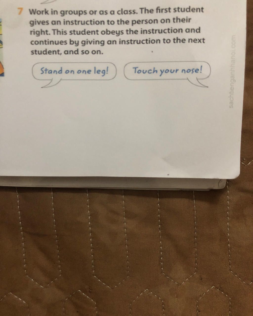 Làm việc theo nhóm hoặc theo lớp. Học sinh đầu tiên đưa ra chỉ dẫn cho người bên phải. Học sinh này tuân tho hướng dẫn và tiếp tục bằng cách đưa ra hướng dẫn cho học sinh trực tuyến, ....