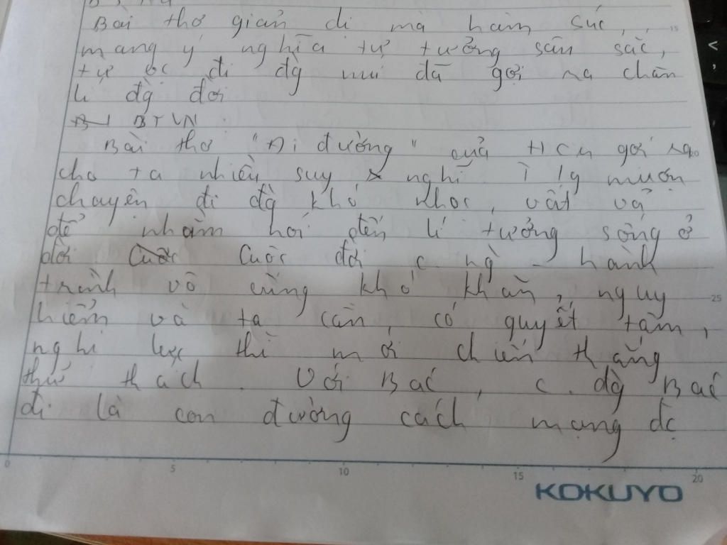 Đọc bài thơ " đi đường" là đứa con tinh thần của lãnh tụ vĩ đại của Hồ Chí Minh. Người đi đường trong hoàn cảnh tay chân bị gông cùm xiềng xích. Con đường đi càng ngày càng khó khăn, phía trước là núi sau lưng của chỉ là núi, núi cao lại còn núi cao hơn, sự khó khăn càng trập trùng. Nhưng nối khổ của người đi đường sẽ bị kéo dài triền miên không biết bao giờ mới dứt được. Người đi đường tưởng chừng tản bộ ngắm núi nhưng thật sự phải đối mặt muôn vàn khó khăn, tuy vậy, người tù vẫn làm chủ được thiên nhiên.