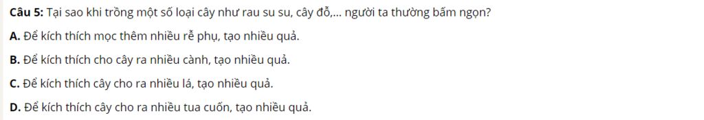 Câu `5:` Tại sao khi trồng một số loại cây như rau su su, cây đỗ,... người ta thường bấm ngọn?