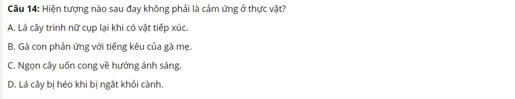 Câu 14: Hiện tượng nào sau đay không phải là cảm ứng ở thực vật?