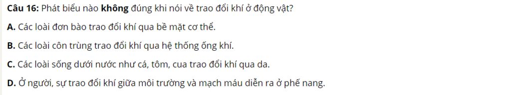 Câu 16: Phát biểu nào không đúng khi nói về trao đổi khí ở động vật?