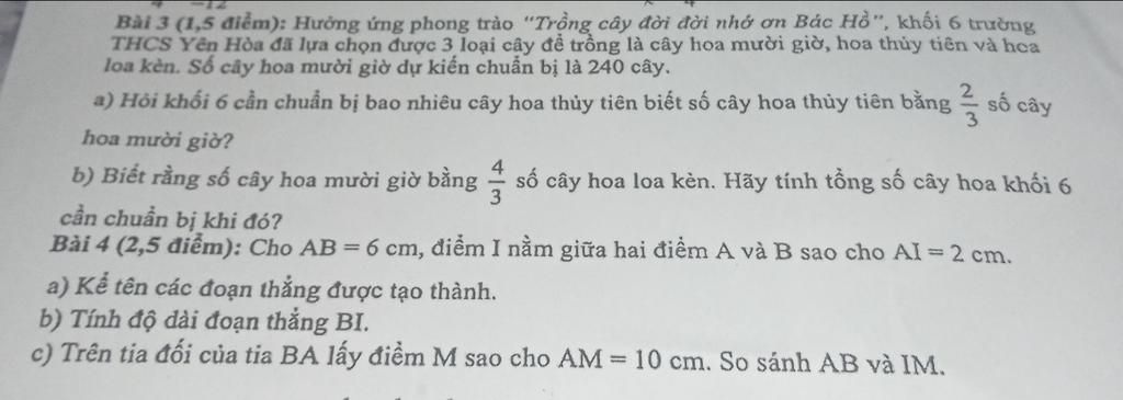 Bài 3 (1,5 điểm): Hưởng ứng phong trào “Trồng cây đời đời nhớ ơn Bác Hồ", khối 6 trường