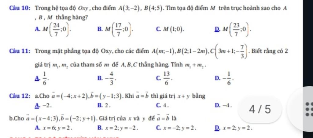 Câu 10: Trong hệ tọa độ Oxy, cho điểm A(3;−2), B(4;5). Tìm tọa độ điểm M trên trục hoành sao cho A