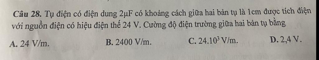 `bbtext{Câu 28:}`$\\$ `bbtext {Tóm tắt}`$\\$ `U=24(V)`$\\$ `d=1(cm)=10^-2(m)`$\\$ `C=2(muF)=2.10^-6(F)`$\\$ $———————————$$\\$ `E=?`$\\$ Cường độ điện trường giữa hai bán tụ là:$\\$ `E=U/d=24/10^-2=2400 text{(V/m)`$\\$ `bb{=>}` `bbtext {Chọn B}`