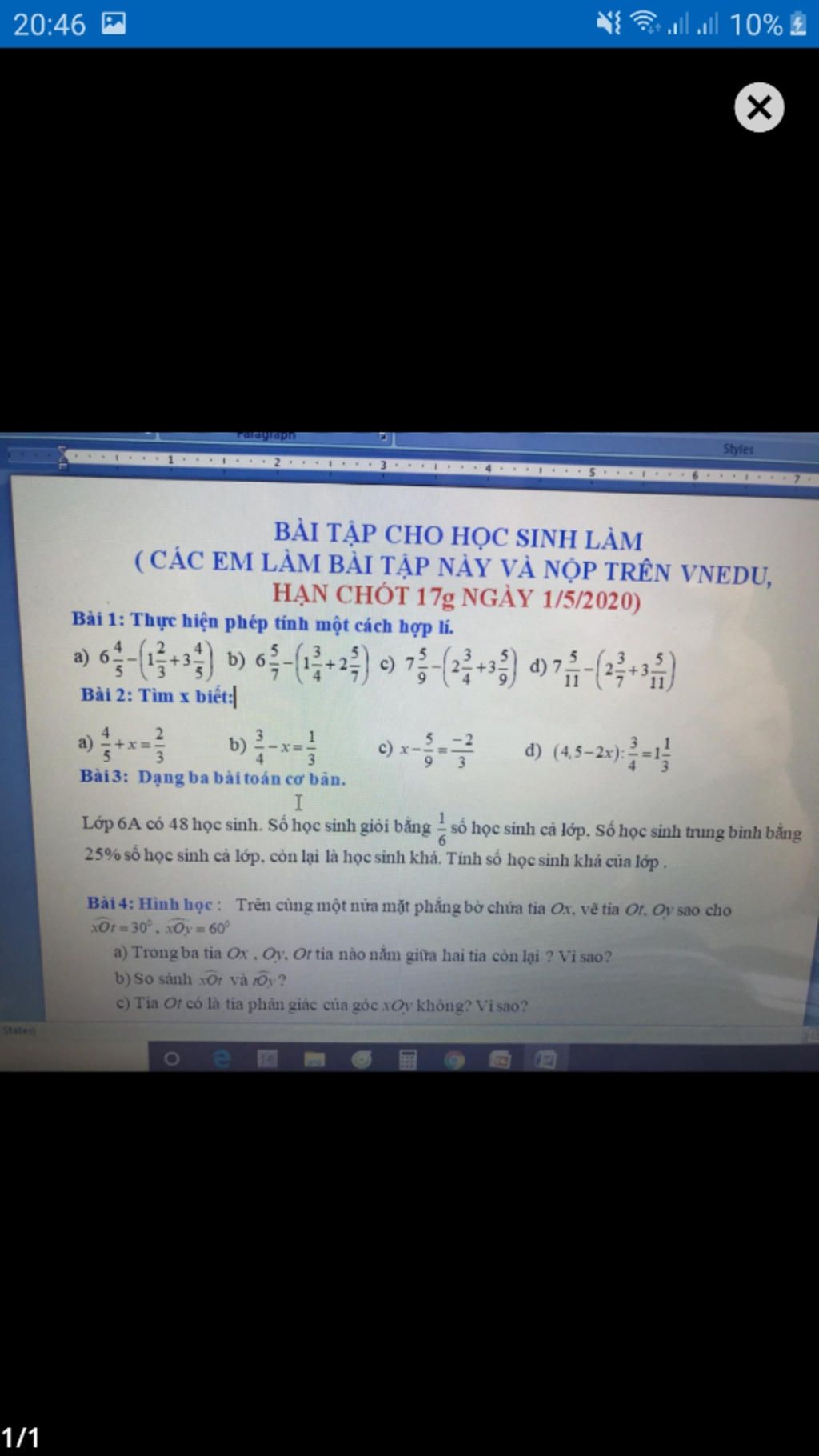 Bài 3: Số học sinh giỏi ở lớp là 48× 1 6 = 8(học sinh) Số học sinh trung bình ở lớp là 48×25%=12(học sinh) Số học sinh khá của lớp là 48-12-8=25(học sinh) Bài 4: a) Vì vẽ ∠xOt =30* ,∠ xOy=60* ⇒ ∠xOt<∠ xOy (vì 30<60) tia ot nằm giữa hai tia Ox và Oy b) Vì ∠ xOy =60*, ∠xOt =30* ⇒∠ tOy= ∠ xOy-∠xOt = 60-30 = 30* ⇒∠tOy = ∠xOt (=30*) c) Vì ∠tOy = ∠xOt (theo b) ⇒ Ot là tia phân giác của ∠xOy và bài 1, 2 ko bít làm nhoa đừng hỏi nhìu ok ok con dê bài 1 tuy bít làm bài mà ko làm