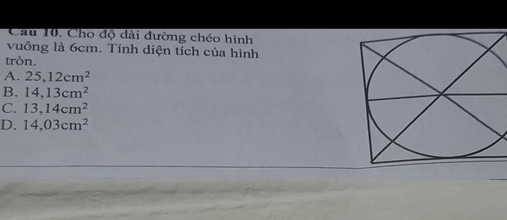 đầu tiên ta lấy đường chéo áp dụng công thức tính hình thoi bởi vì hình vuông giống hình thoi rồi chia 4 để lấy một cạnh rồi áp dụng công thức hình tròn là nhân với 3,14 thì ta được kết quả là b