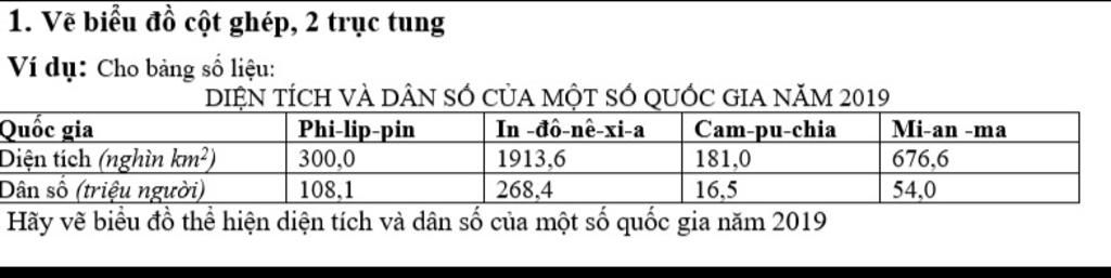 Hãy vẽ biểu đồ thể hiện diện tích và dân số của một số quốc g ...