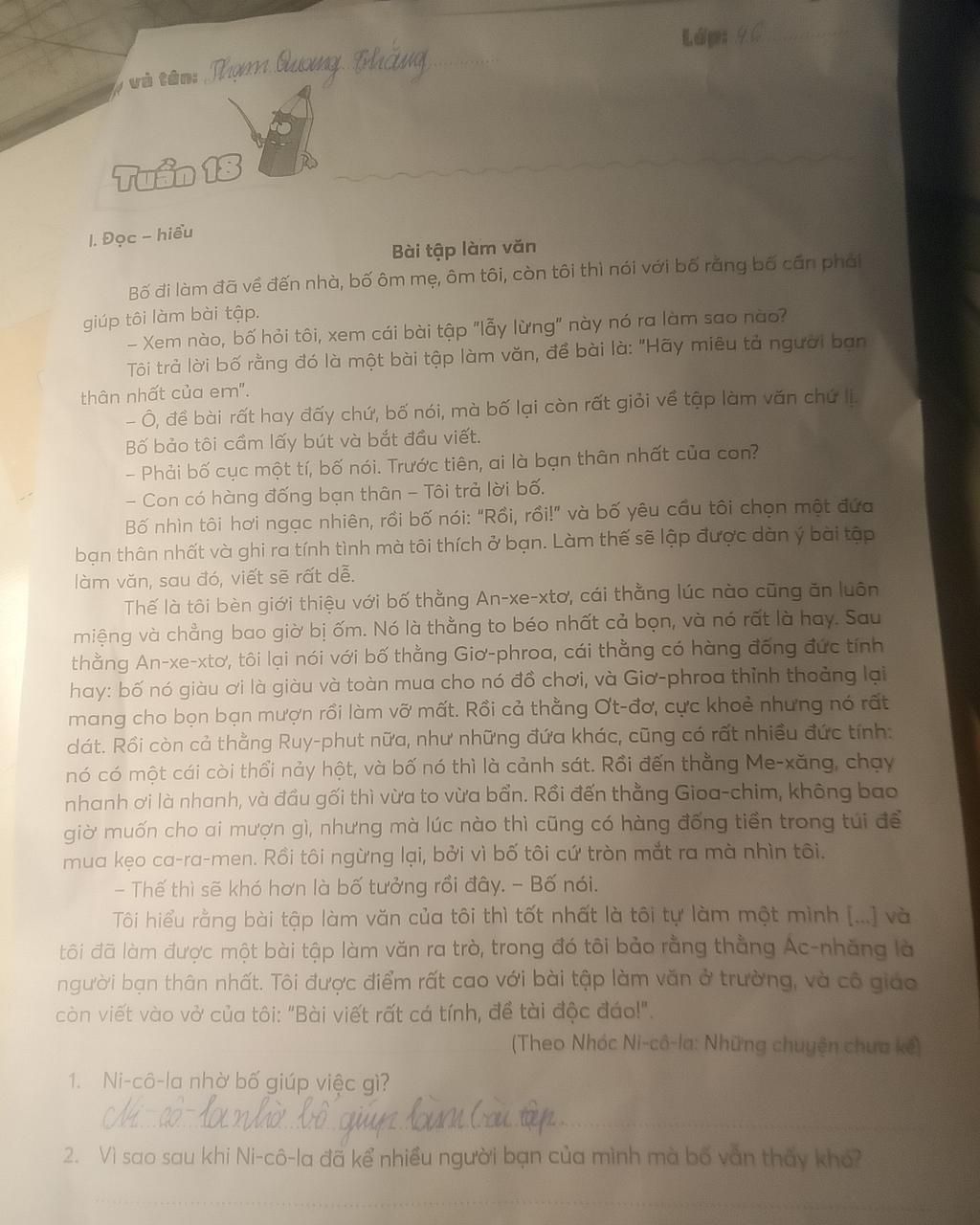 `to` Vì Ni - cô - la đang kể về rất nhiều bạn để mong bố có thể giúp bài tập , nhưng bố của Ni - cô - la lại không biết những người bạn ấy của con . Đề bài yêu cầu miêu tả về người bạn thân nhất của em , thì chỉ có Ni - cô - la biết về bạn , mới làm được .