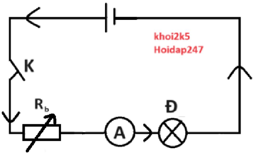 vẽ sơ đồ mạch điệm gồm nguồn điện, khóa K, bóng đèn và ampe kế mắc nối tiếp với bóng đèn, biến trở mắc nối tiếp.