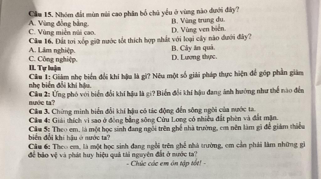 Câu 15. Nhóm đất mùn núi cao phân bố chủ yếu ở vùng nào dưới đây?