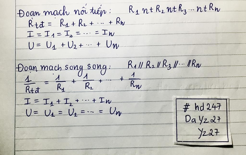 Câu 2: Viết công thức xác định điện trở tương đương Rtđ, hiệu điện thế U và cường độ dòng điện I trong đoạn mạch nối tiếp, đoạn mạch song song của dòng điện một chiều.
