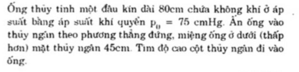Gọi độ cao cột thủy ngân đi vào ống là `h_2 (cm)`. ĐK: `h_2 \le 45 (cm)`