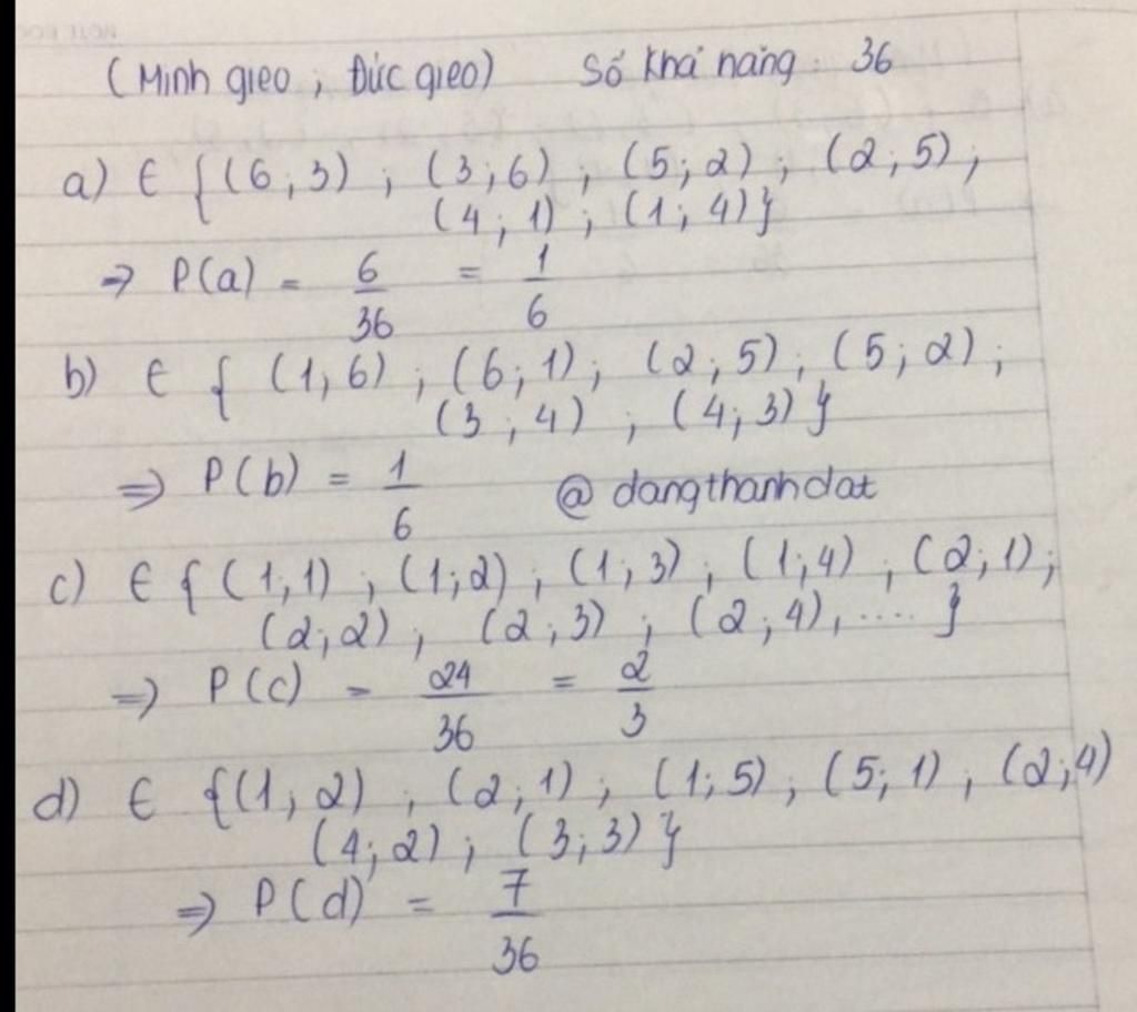 Minh và Đức mỗi người gieo một con xúc xắc. Tìm Xác suất để a) Hiệu số giữa số chấm xuất hiện trên hai con xúc xắc bằng 3 b) Tổng số chấm xuất hiện trên 2 con xúc xắc bằng 7 c) Số chấm xuất hiện trên 2 con xúc xắc đều nhỏ hơn 5 d) Tổng số chấm trên hai mặt là số chia hết cho 3