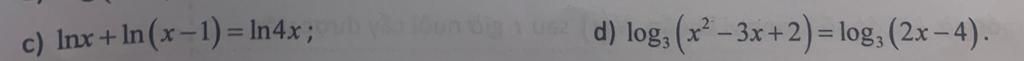 c) `lnx+ln(x-1)=ln4x(dk:x>1)`