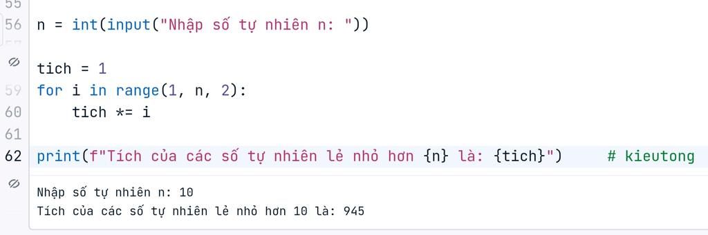 Viết đoạn câu lệnh tính tích các số tự nhiên lẻ nhỏ hơn n (n được nhập từ bàn phím) trong python
