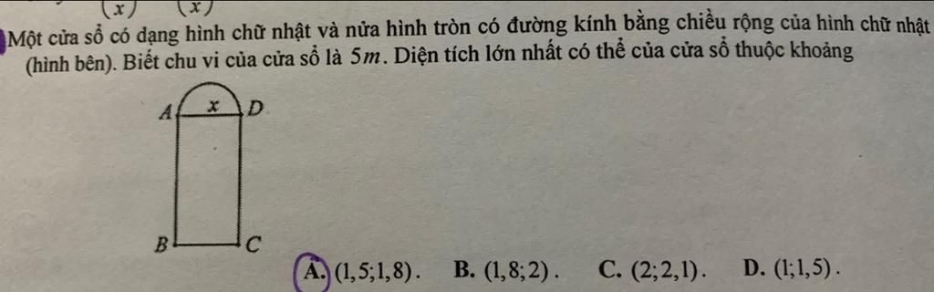 (hình bên). Biết chu vi của cửa sổ là 5m. Diện tích lớn nhất có thể của cửa sổ thuộc khoảng