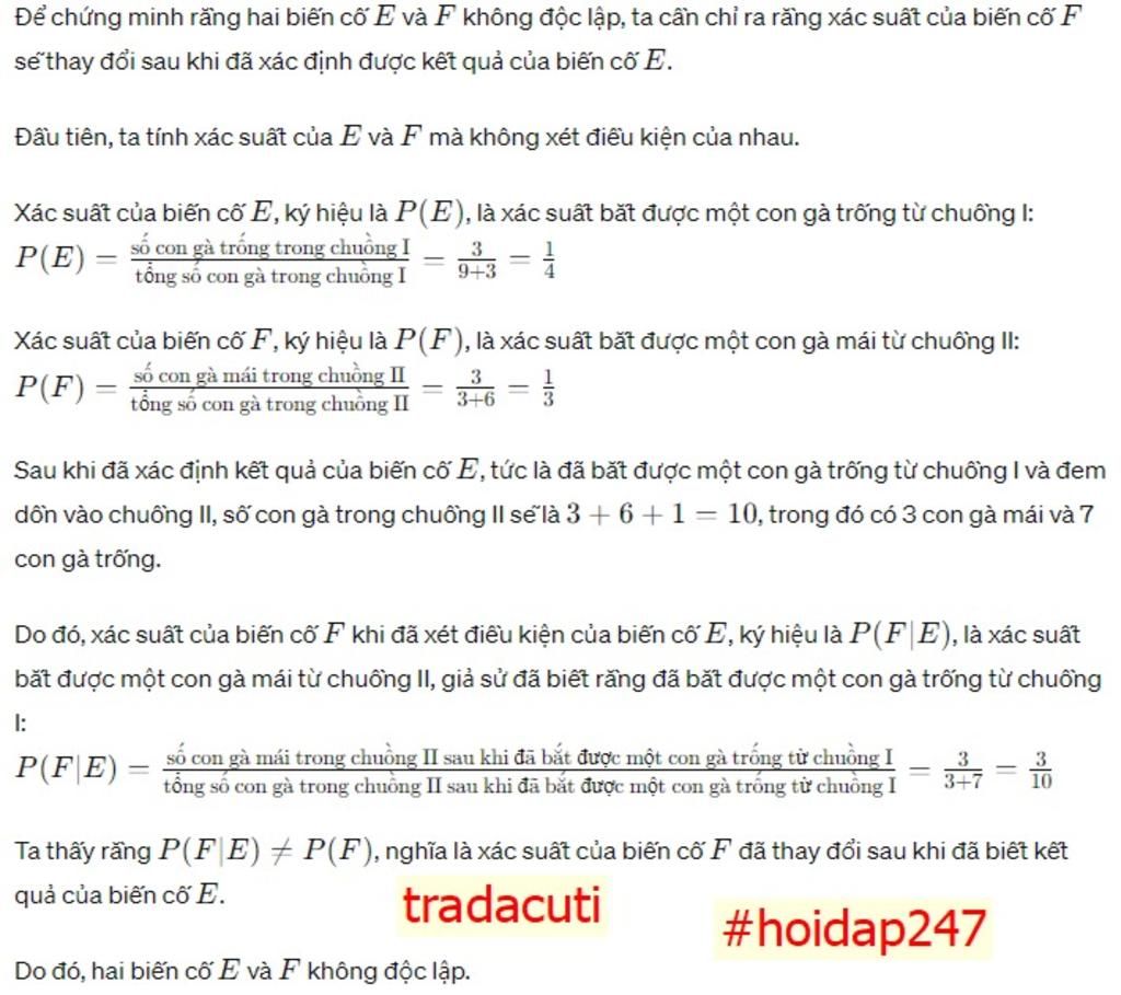 Có hai chuồng nuôi gà. Chuồng I có 9 con gà mái và 3 con gà trống. Chuồng II có 3 con gà mái và 6 con gà trống. Bắt ngẫu nhiên một con gà của chuồng I để đem bán rồi dồn các con gà còn lại của chuồng I vào chuồng II. Sau đó bắt ngẫu nhiên một con gà của chuồng II. Xét hai biến cố sau: