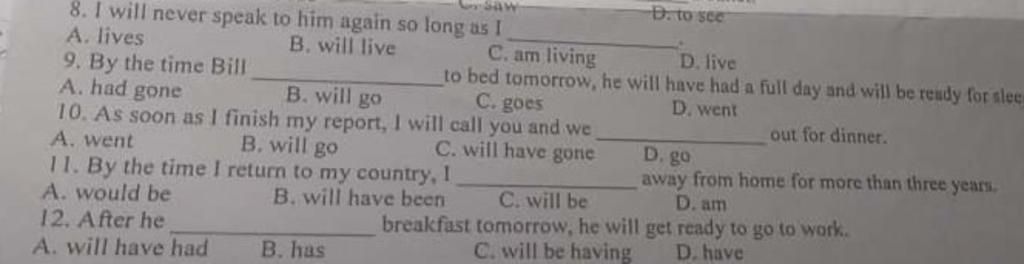 $\text{Form:}$ By the time + S + V(s/es), S + V(tương lai hoàn thành)