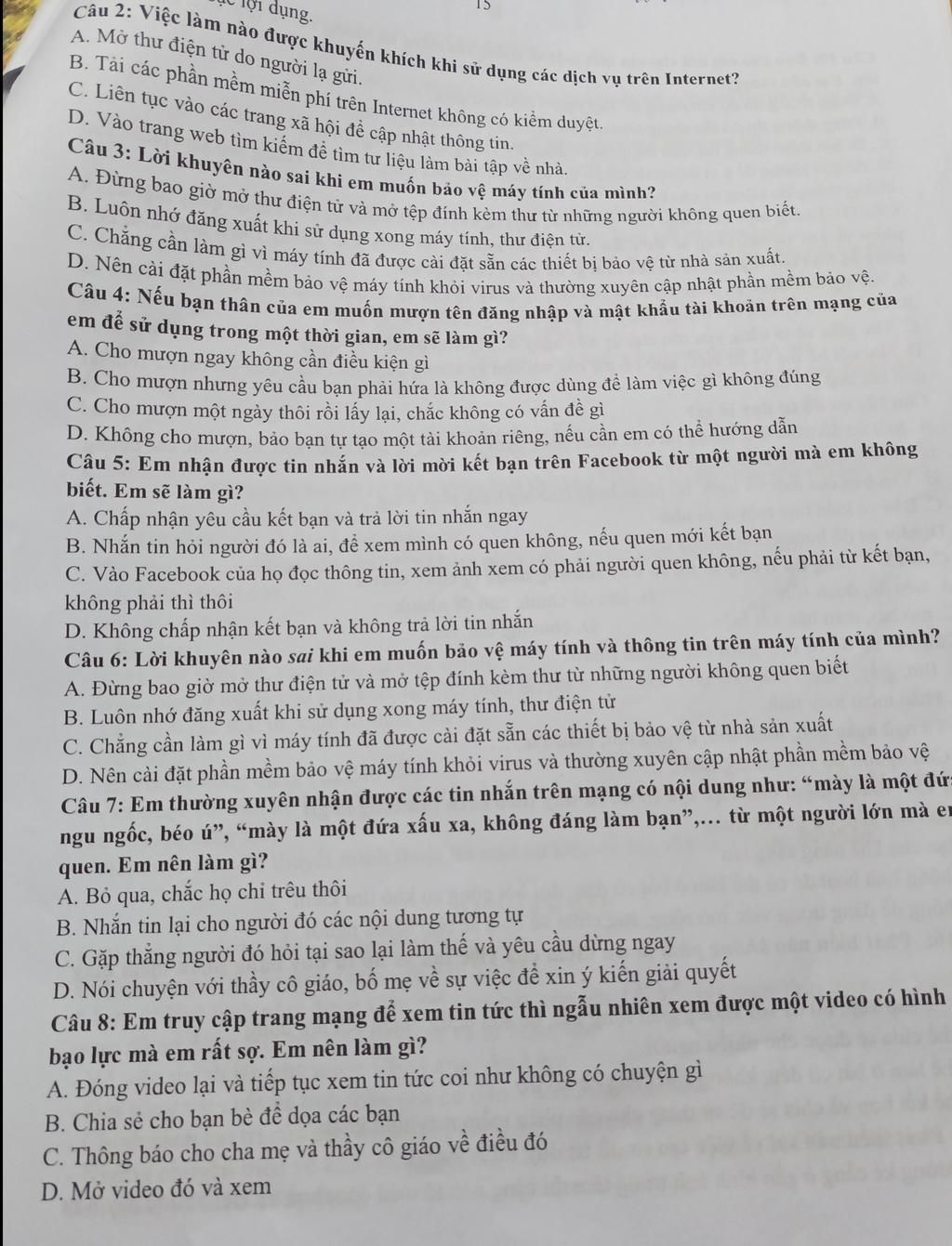 Câu 2: Việc làm nào được khuyến khích khi sử dụng các dịch vụ trên Internet?