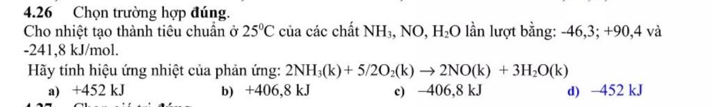 $\rm \Delta_rH^°_{298}=\sum\Delta_fH^°_{298\ (sp)}-\sum\Delta_fH^°_{298\ (cd)}=2\Delta_fH^°_{298\ (NO)}+3\Delta_fH^°_{298\ (H_2O)}-2\Delta_fH^°_{298\ (NH_3)}=2×(90,4)+3×(-241,8)-2×(-46,3)=-452\ (kJ)$