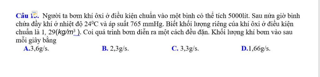 Câu 1. Người ta bơm khí ôxi ở điều kiện chuấn vào một bình có thể tích 5000lít. Sau nửa giờ bình